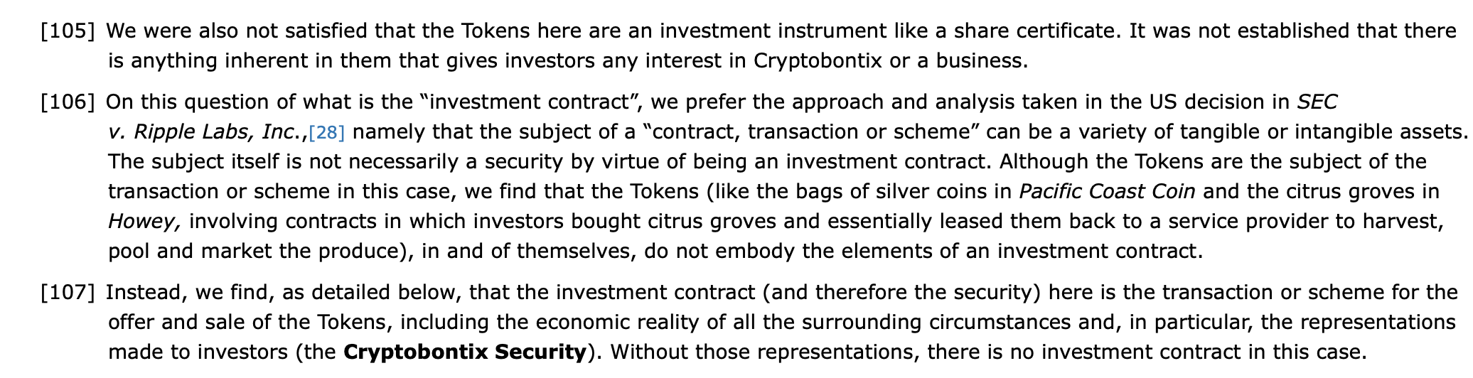 The vast majority of tokens actually don't have any special technical features or connection to any smart contract system, they're merely used within a larger business system created by management. This thinking can be found in the 2024 Hogg decision from the Capital Markets Tribunal at paragraph 105 (quoted below).